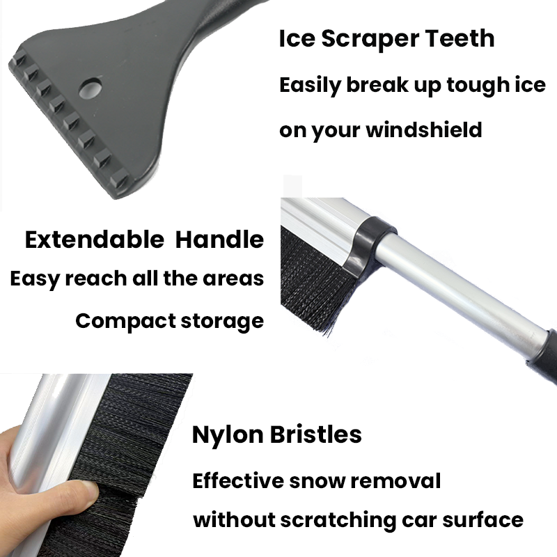 伸缩铝合金拉杆: 长度自由调节,清洁冰雪方便,适用于各种型号。 两用多功能铲: 容易摆脱冬季冰雪,汽车保养必不可少。除了清除汽车,电动汽车,自行车和积雪覆盖的房屋的积雪和霜冻外,玻璃门窗也可以被扫除。 除雪铲头: 采用ABS高强度塑料铸造成型,坚硬牢固,低温性能好,可以铲雪。 雪杜德的设计: 凹槽使除雪更清洁。