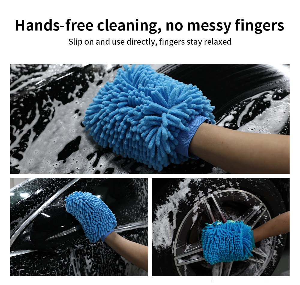 超柔雪尼尔材质,不伤车漆与玻璃,呵护漆面 高泡强吸水,吸附污垢更彻底,减少划痕产生 万能弹性袖口,适配各种手型,佩戴稳固不滑落 双面可用,细腻面精洗细节,绒面大面积擦拭 易洗快干,可机洗重复使用,耐用更环保